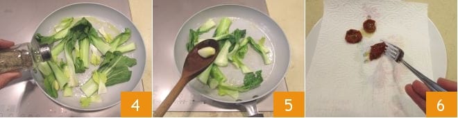 Lassen Sie ihn ein paar Minuten bei mittlerer Hitze einfallen. Mit Salz und Pfeffer abschmecken 4, dann den Knoblauch entfernen 5 und das Gemüse beiseitestellen. Lassen Sie die getrockneten Tomaten auf Küchenpapier abtropfen, um das überschüssige Öl zu entfernen 6.