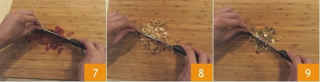 Dann hacken Sie sie grob 7. Machen Sie dasselbe mit den Walnüssen 8 und den Pistazien 9.