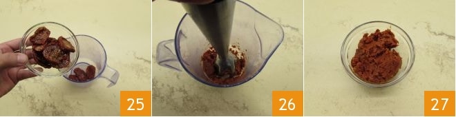 Bereiten Sie das Pesto aus getrockneten Tomaten zu. Legen Sie die getrockneten Tomaten in einen hohen Behälter 25 und pürieren Sie alles mit einem Stabmixer 26, bis Sie eine Creme erhalten 27.