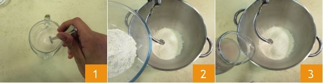 Um die herzhaften Teilchen zuzubereiten, beginnen Sie als Erstes mit der Herstellung des Blätterteigs. Lösen Sie die Hefe in Wasser bei Raumtemperatur auf 1. Geben Sie in eine Küchenmaschine mit Knethaken die beiden Mehle 2, fügen Sie dann die in Wasser aufgelöste Hefe hinzu 3