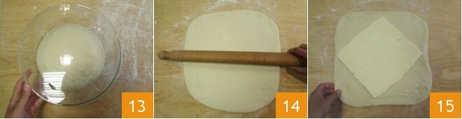 Nach dem Gehen 13 den Teig auf eine bemehlte Arbeitsfläche legen und mit dem Nudelholz zu einem 30x30 cm großen Quadrat ausrollen 14. Legen Sie dann das Butterstück in die Mitte des Quadrats, sodass ein Rhombus entsteht 15.