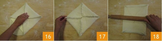 Falten Sie dann die Enden des darunterliegenden Teigs zur Mitte des Butterstücks 16, sodass die Kanten verbunden, aber nicht überlappen. Verschließen Sie die Enden mit den Händen 17. Lassen Sie es 10-15 Minuten im Kühlschrank ruhen. Legen Sie das entstandene Quadrat erneut auf eine leicht bemehlte Arbeitsfläche und rollen Sie es in eine Richtung 18.