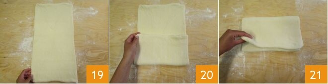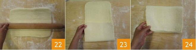 Nehmen Sie dann das Teigstück, legen Sie es wieder auf die bemehlte Arbeitsfläche; rollen Sie es in Richtung der Falten 22, bis Sie ein Rechteck mit den gleichen Maßen wie zuvor erhalten. Wiederholen Sie die Dreifachfaltung, indem Sie immer eine Kante des Teigs auf ein Drittel des Rechtecks und die andere Kante zum Abdecken falten (23-24). Wickeln Sie es in Frischhaltefolie und legen Sie es für weitere 30 Minuten in den Kühlschrank. Machen Sie ein letztes Mal eine Dreifachfaltung wie gerade gemacht. Wickeln Sie es erneut in Frischhaltefolie und lassen Sie es diesmal für etwa 120 Minuten im Kühlschrank ruhen.