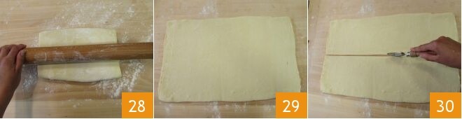 Wenn der Blätterteig geruht hat, legen Sie ihn auf eine bemehlte Arbeitsfläche und rollen Sie ihn mit einem Nudelholz 28 aus, bis Sie ein 30x60 cm großes Rechteck von etwa 3 mm Dicke erhalten 29. Schneiden Sie dann das Rechteck der Länge nach in der Mitte durch 30, um zwei 15x60 cm Rechtecke zu erhalten.