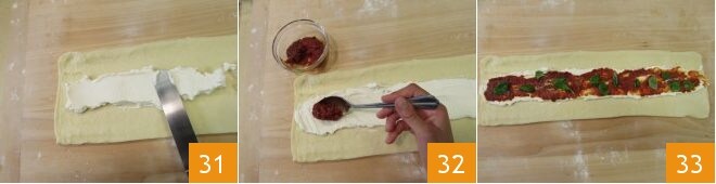 Verteilen Sie die Hälfte des Ricottas nur auf den mittleren Streifen der beiden Rechtecke 31, streuen Sie die Hälfte des Pestos aus getrockneten Tomaten darüber 32 und fügen Sie ein paar Basilikumblätter hinzu 33.