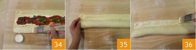 Bestreichen Sie den Rand des ungefüllten Teigs mit der Milch 34 und falten Sie ihn, um die Füllung zu bedecken 35. Bestreichen Sie dann auch die andere Seite 36