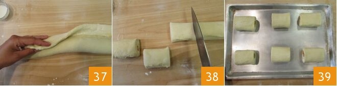 und ziehen Sie sie zu sich hin, sodass sie am darunterliegenden Teig haftet 37, um eine Rolle zu erhalten. Schneiden Sie die unregelmäßigen Enden ab 38 und schneiden Sie etwa 7 cm lange Zylinder ab 38. Legen Sie sie auf ein Backblech, mit der Naht nach unten 39.