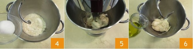 und den Zucker 4. Schalten Sie die Küchenmaschine ein, bis Sie einen homogenen Teig erhalten 5. Geben Sie dann das Öl dazu 6 und lassen Sie es einarbeiten, bis der Teig am Haken hängt.