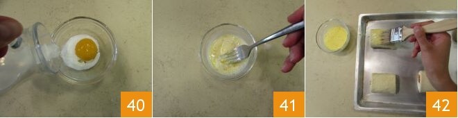 In einer kleinen Schüssel Eigelb und Milch geben 40; mit einer Gabel verquirlen 41 und verwenden Sie es, um die Oberfläche der Teilchen zu bedecken 42.