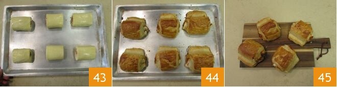Lassen Sie sie eine Stunde bei Raumtemperatur ohne Luftzug gehen 43. Backen Sie sie anschließend im vorgeheizten statischen Ofen bei 200° für 30 Minuten auf der mittleren Schiene. Dann aus dem Ofen nehmen 44 und die warmen herzhaften Teilchen servieren 45.