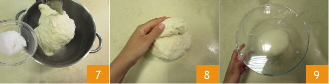 Zum Schluss fügen Sie das Salz hinzu 7 und arbeiten Sie den Teig noch einige Minuten, bis es vollständig aufgenommen ist. Übertragen Sie den Teig auf eine Arbeitsplatte 8 und formen Sie eine Kugel. Legen Sie den Teig in eine Schüssel, decken Sie ihn mit Frischhaltefolie ab 9 und lassen Sie ihn 2 Stunden bei Raumtemperatur gehen.