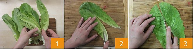 Um die kalten Salatrollen mit Fleisch zuzubereiten, beginnen Sie damit, den Salatkopf zu entblättern 1: Entfernen Sie die härteren oder beschädigten äußeren Blätter und schneiden Sie den Strunk ab. Waschen und trocknen Sie die Salatblätter gut unter fließendem Wasser und entfernen Sie mit einem kleinen Messer die Mittelrippe des Blattes 2, dann teilen Sie es in zwei Hälften 3.