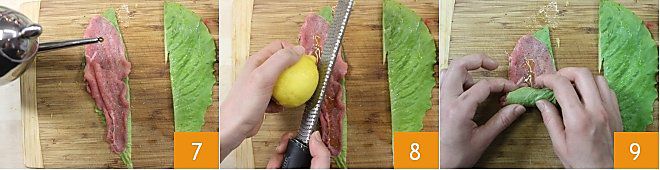 Gießen Sie einen Schuss Öl über die gewürzten Scheiben 7 und reiben Sie etwas Zitronenschale darüber 8. Wenn Sie möchten, können Sie etwas Senf auf die Carpaccio-Scheibe streichen. Rollen Sie nun das gefüllte Salatblatt auf, wobei die Nahtseite unten liegt 9, damit die Rollen nicht aufgehen und auseinanderfallen. Ihre kalten Salatrollen mit Fleisch sind bereit, um genossen zu werden! Denken Sie daran, alles bis zum Servieren im Kühlschrank aufzubewahren.