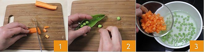 Um die kalten Salatrollen mit Gemüse zuzubereiten, beginnen Sie damit, eine Karotte zu schälen und in ziemlich kleine Würfel zu schneiden 1. Schälen und waschen Sie dann die Erbsen 2 und kochen Sie sie zusammen mit den Karottenwürfeln etwa 10 Minuten in einem Topf 3; wenn Sie bereits geschälte Erbsen verwenden, benötigen Sie etwa 65 g. Sobald sie gekocht sind, lassen Sie sie abtropfen und bewahren sie in einer Schüssel auf.