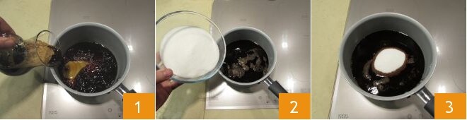 Um den Kaffeelikör vorzubereiten, beginnen Sie damit, Kaffee mit der Moka (oder, wenn Sie es bevorzugen, mit der Kaffeemaschine) zu machen, den Sie dann in einen hohen Topf geben 1; fügen Sie den Zucker hinzu (2-3) und stellen Sie die Flamme sehr niedrig ein, um ihn aufzulösen 3.