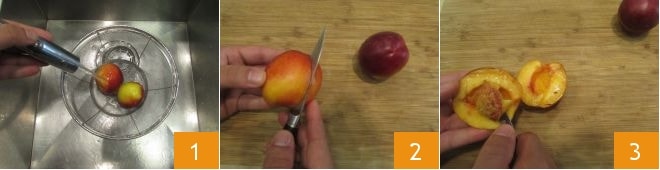 Um die karamelisierten Pfirsiche zuzubereiten, beginnen Sie den Backofen auf 180° Umluft vorzuheizen, dann wenden Sie sich den Pfirsichen zu: Waschen Sie sie 1, schneiden Sie sie in Hälften 2 und entfernen Sie den Kern, indem Sie ihn mit einem kleinen Messer einschneiden 3.
