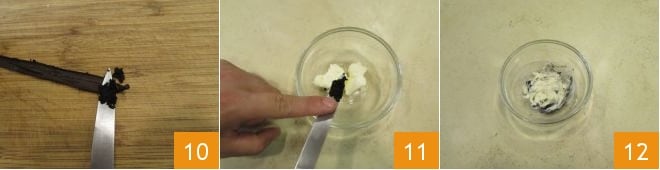 Während das Karamell kocht, geben Sie die in Stücke geschnittene Butter bei Raumtemperatur in eine Schüssel. Dann sammeln Sie mit einem Messer die Samen von der Spitze der Vanilleschote 10 und fügen Sie sie der Butter hinzu 11, indem Sie alles gut mit einem Löffel vermengen 12.