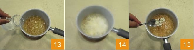 Wenn das Karamell bernsteinfarben geworden ist, nehmen Sie den Topf vom Herd und fügen Sie die Sahne unter Rühren mit einem Schneebesen hinzu, vorsichtig, denn es wird viel Schaum bilden (13-14). Rühren Sie die Sahne in das Karamell ein und fügen Sie dann auch die mit Vanille aromatisierte Butter hinzu 15.
