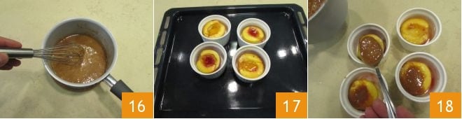 und rühren Sie gut, bis alle Zutaten gut vermischt sind und das Karamell dick und reichhaltig ist 16. In der Zwischenzeit werden Ihre Pfirsiche fertig sein: Nehmen Sie sie aus dem Ofen 17 und geben Sie einen reichlichen Löffel Karamell auf jeden Pfirsich, direkt in jedes Cocotte 18.