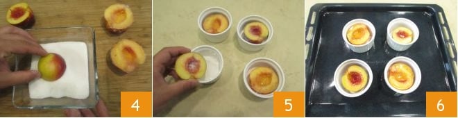 Tauchen Sie die halben Pfirsiche mit dem Fruchtfleisch in Zucker 4, dann legen Sie sie in die Cocotten 5 und stellen Sie sie auf ein Backblech 6; dann backen Sie sie im vorgeheizten Ofen bei 180° für 25 Minuten 6.