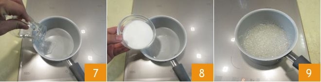 In der Zwischenzeit kümmern Sie sich um das Karamell: Geben Sie das Wasser in einen großen Topf 7 und fügen Sie den Zucker hinzu 8. Ohne zu rühren, erhitzen Sie die Mischung aus Wasser und Zucker 9, bis Sie eine schöne bernsteinfarbene Farbe erhalten.