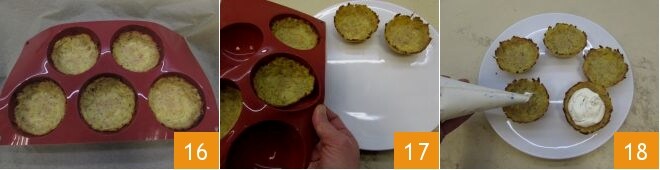 Zu diesem Zeitpunkt sind Ihre Kartoffelkörbchen fertig: Nehmen Sie sie aus dem Ofen 16 und lassen Sie sie abkühlen. Wenn sie Raumtemperatur erreicht haben, lösen Sie sie aus der Form und legen Sie sie auf einen Teller 17. Füllen Sie sie mit der Käsecreme 18.
