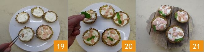 Garnieren Sie mit Lachswürfeln 19 und Minzblättern 20. Ihre gefüllten Kartoffelkörbchen mit Lachs sind bereit, serviert zu werden 21!