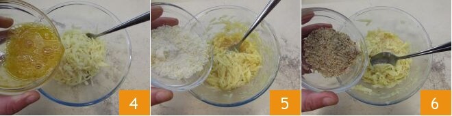 Fügen Sie das Ei zu den Kartoffeln hinzu 4. Geben Sie dann auch den geriebenen Käse 5 und das Haselnussmehl 6 hinzu. Mischen Sie die Zutaten gut mit einem Löffel, bis Sie eine homogene Masse erhalten.