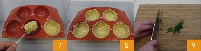 Verteilen Sie die erhaltene Masse in 6 Silikonformen mit einer Kapazität von 100 g 7. Drücken Sie die Masse gut an die Ränder der Form mit einem Löffel: Die Masse soll die Form der Form annehmen und innen hohl bleiben. Sobald sie vorbereitet sind 8, backen Sie sie in einem vorgeheizten statischen Ofen bei 220°C für 20 Minuten (oder in einem Heißluftofen bei 200°C für 10 Minuten). Während Ihre Körbchen backen, widmen Sie sich der Käsecremefüllung: Hacken Sie die Minze fein, lassen Sie einige Blätter für die Enddekoration ganz 9.