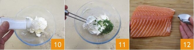 Geben Sie dann den Frischkäse in eine Schüssel, salzen 10 und pfeffern Sie. Fügen Sie die gehackten Minzblätter hinzu und mischen Sie alle Zutaten gut 11. Füllen Sie die Masse in einen Spritzbeutel und stellen Sie sie beiseite. Dann kümmern Sie sich um den Lachs: Entfernen Sie die Gräten mit einer Küchenpinzette 12 und die Haut, falls vorhanden, mit der Klinge eines Messers.