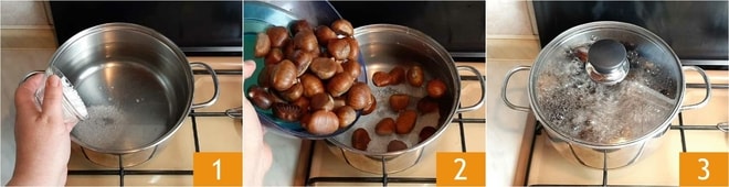 Um den Kastanienkuchen zuzubereiten, füllen Sie zunächst einen Topf mit Wasser, salzen Sie es leicht mit grobem Salz 1 und fügen Sie die Maronen hinzu 2. Wenn das Wasser zu kochen beginnt, decken Sie es mit einem Deckel ab 3 und lassen Sie es etwa 30-40 Minuten kochen (abhängig von der Größe der Kastanien).