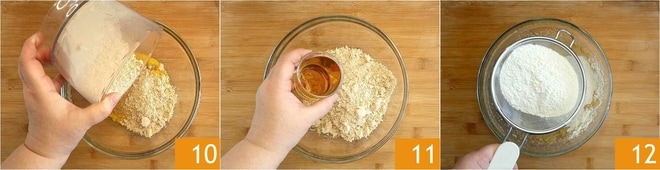die gemixten Maronen 10, den Rum 11 und das gesiebte Mehl 12.