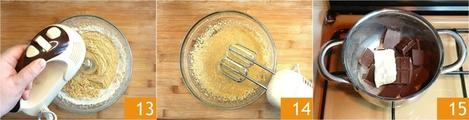 Arbeiten Sie mit einem elektrischen Schneebesen 13, bis Sie eine cremige Mischung erhalten 14. Kratzen Sie den gesamten Teig mit einem Spatel zusammen, auch von den Rändern der Schüssel. Jetzt kümmern Sie sich um die Schokolade: zerbrechen Sie sie und geben Sie sie in einen Topf zusammen mit der Butter 15.
