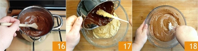 Lassen Sie alles bei sehr niedriger Hitze schmelzen und rühren Sie mit einem Holzlöffel um 16, alternativ können Sie auch die Mikrowelle verwenden, um diesen Vorgang durchzuführen. Lassen Sie die Schokolade abkühlen, dann fügen Sie sie dem Teig hinzu 17 und mischen Sie mit einem Spatel 18.