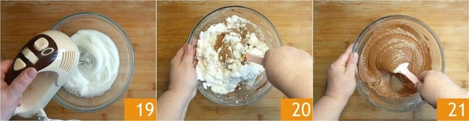 Schlagen Sie die Eiweiße zu sehr steifem Schnee 19, dann fügen Sie sie vorsichtig dem Teig hinzu und heben Sie sie von unten nach oben unter 20. Wenn Sie eine homogene Mischung erhalten haben 21,