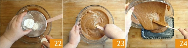 fügen Sie das gesiebte Backpulver hinzu 22 und mischen Sie erneut vorsichtig, um es aufzunehmen 23. Fetten Sie eine rechteckige Form von 22x15 cm ein und gießen Sie den Teig hinein 24.