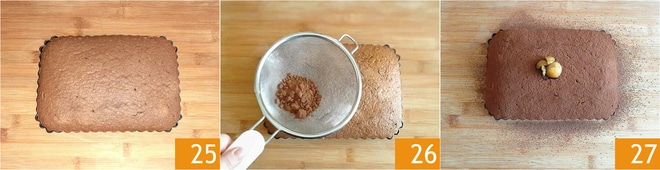 Backen Sie es im vorgeheizten statischen Ofen bei 180° auf der unteren Schiene für etwa 30 Minuten. Überprüfen Sie immer die Backzeit mit der Zahnstocherprobe. Nehmen Sie den Kuchen aus dem Ofen 25 und lassen Sie ihn abkühlen. Bestäuben Sie ihn mit ungesüßtem Kakao 26, dekorieren Sie ihn mit den zuvor beiseitegelegten Kastanien, indem Sie sie mit etwas Honig bestreichen, und servieren Sie Ihren Kastanienkuchen 27.