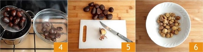 Nach der Zeit die Maronen abgießen 4 und noch warm schälen 5, dabei darauf achten, auch die Haut unter der Schale zu entfernen. Während Sie sie reinigen, geben Sie sie in eine Schüssel 6, bis Sie 200 g erhalten.