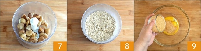 Lassen Sie sie abkühlen. Halten Sie ein paar zur Dekoration zurück und geben Sie die restlichen in einen Mixer 7. Mixen Sie, bis Sie eine Art körniges Mehl erhalten 8, und legen Sie es dann beiseite. Trennen Sie die Eigelbe von den Eiweißen in zwei Schüsseln. Fügen Sie in die Schüssel mit den Eigelben den braunen Zucker hinzu 9,