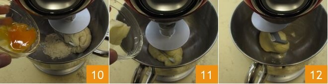 und lassen Sie den Teig binden, dann das Eigelb bei Raumtemperatur hinzufügen 10. Sobald der Teig wieder gut gebunden ist, die weiche Butter hinzufügen 11. Wenn die Butter vollständig aufgenommen ist und der Teig am Haken gebunden ist 12, können Sie den Teig auf eine Arbeitsfläche übertragen.