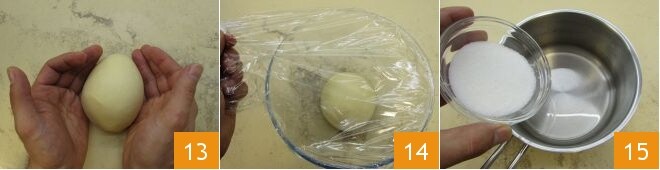 Einige Momente mit den Händen bearbeiten, dann eine runde Form geben 13 und in eine Schüssel legen; mit Frischhaltefolie abdecken 14 und etwa 6 Stunden im ausgeschalteten Ofen mit eingeschaltetem Licht gehen lassen (bei einer Temperatur von etwa 26°). In der Zwischenzeit den karamellisierten Rosmarin vorbereiten: in einem kleinen Topf Wasser und Zucker 15 geben;