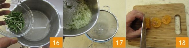 Wenn die Mischung fast kocht, die Rosmarinnadeln hinzufügen und etwa 5 Minuten kochen lassen, dann die Nadeln aus dem Sirup mit einem feinmaschigen Sieb abseihen 17. Die kandierten Rosmarinnadeln beiseite legen und die kandierte Mandarine vorbereiten: in Scheiben schneiden 18