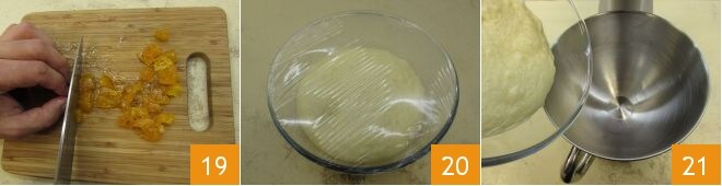 dann in Stücke schneiden 19 und ebenfalls beiseite legen. Nach den 6 Stunden Gärung den Teig nehmen, der sein Volumen verdoppelt hat 20. Den gegangenen Teig in die Küchenmaschine mit Haken geben 21;