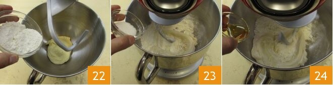 dann das gesiebte Mehl hinzufügen 22 und bei mittlerer Geschwindigkeit kneten. Dann den Zucker 23, den Honig 24