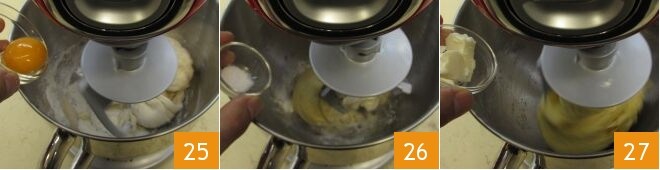 und das Eigelb bei Raumtemperatur 25 hinzufügen; die Küchenmaschine laufen lassen, bis die Zutaten gut aufgenommen sind und der Teig gebunden ist, dann das Salz 26 hinzufügen, dann die weiche Butter 27.