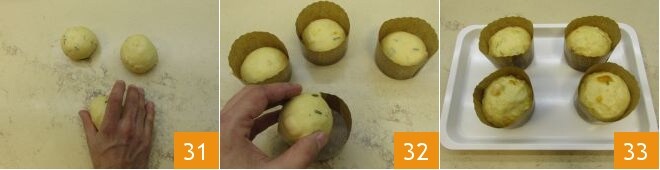 Auf der Arbeitsfläche jeden Teil zu Kugeln formen 31 und in die jeweiligen Papierformen für Pandorini legen 32. Etwa 4 Stunden bei Raumtemperatur gehen lassen; sie sind fertig, wenn sie 3/4 der Form erreicht haben 33.
