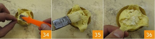 Dann mit einem Cutter einen Kreuzschnitt auf die Oberseite jedes Pandorino machen und die Ränder abheben 34. Mit geschmolzener Butter bestreichen 35 und die Ränder nach innen falten 36,