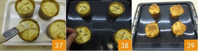 die Oberfläche der kleinen Panettone erneut bestreichen 37. Auf ein Backblech legen, einige beiseitegelegte Rosmarinnadeln hinzufügen 38 und im vorgeheizten statischen Ofen bei 180° etwa 30 Minuten backen (wir empfehlen nicht, den Umluftofen zu verwenden). Sobald sie fertig sind, aus dem Ofen nehmen 39 und etwas abkühlen lassen, bevor Sie Ihre kleinen Panettone mit kandierten Mandarinen und Rosmarin servieren!