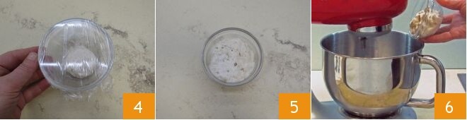 wenn Sie einen glatten Teig erhalten haben, geben Sie dem Teig eine kugelförmige Form und legen Sie ihn in die Schüssel, bedeckt mit Frischhaltefolie 4. Lassen Sie ihn etwa 30 Minuten bei Raumtemperatur ruhen. Dann über Nacht im Kühlschrank reifen lassen (10 bis 12 Stunden). Nach der angegebenen Zeit können Sie mit dem ersten Teig beginnen: den Vorteig 5 herausnehmen und in die Küchenmaschine 6 geben.