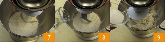 Den Haken anbringen und das gesiebte Mehl 7 hinzufügen, die Küchenmaschine starten und nach und nach das Wasser bei Raumtemperatur 8 hinzufügen, dann den Zucker 9